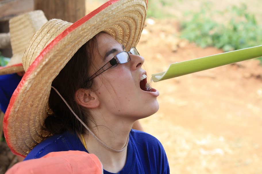 Nous descendons une petite pente et arrivons à un hangar ou se trouve six grands éléphants dont deux femelles avec leurs petits. C'est l'heure de les toucher pour la première fois, de les approcher vraiment. Nous allons leur donner à manger des bananes. Ernestine et moi en attrapons donc, comme les autres, et c'est parti. Nous pouvons tous constater que les éléphants comprennent très bien l'ordre qui leur demande d'ouvrir la bouche. La leur est toute pointue, on voit bien les petites défenses de chaque côté, leur grosse langue, et au fond les dents pour mastiquer, grosses d'environ 10 cm de long sur 20 de large -ce ne sont probablement pas les vraies mesures, je donne l'impression que ça m'a laissé. Plus tard, je les verrai même casser des troncs de palmier entre leurs mâchoires, je suis impressionnée par leur force.
