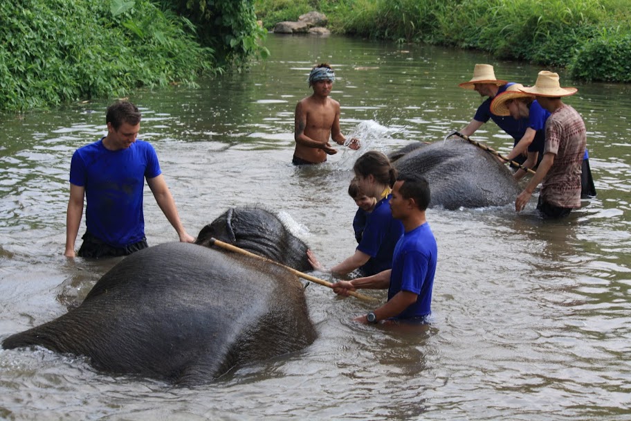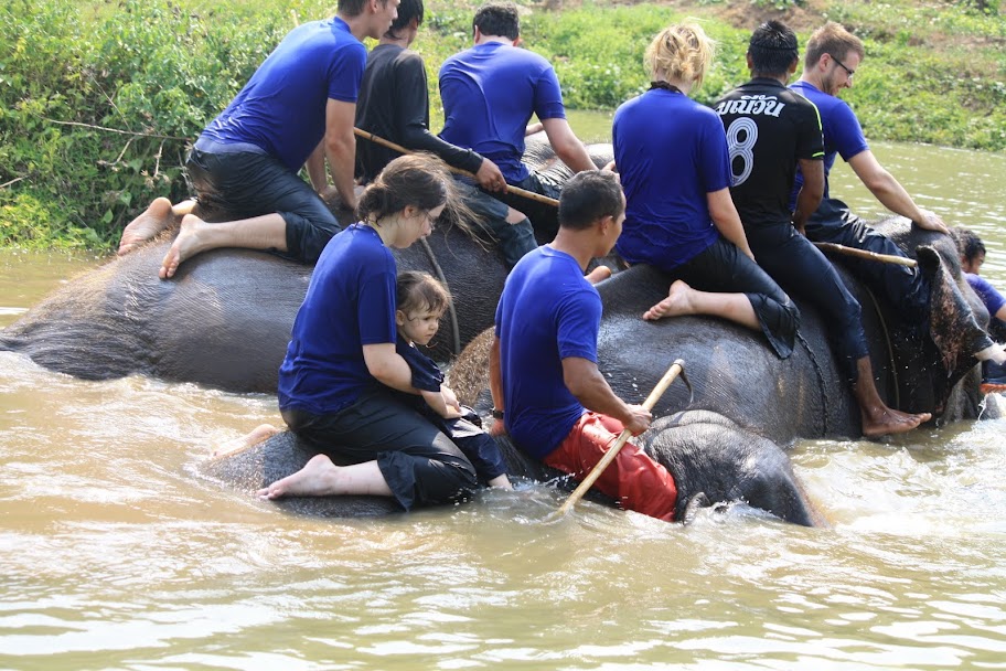 Nous arrivons heureusement à l'endroit où l'on baigne les éléphant, où la rivière s'élargit un peu. Nous pouvons enfin nous rincer de toute cette terre. Frotter les éléphants. Regarder les autres les laver, et s'asperger d'eau en utilisant la trompe comme un jet d'eau. C'est vraiment rigolo.